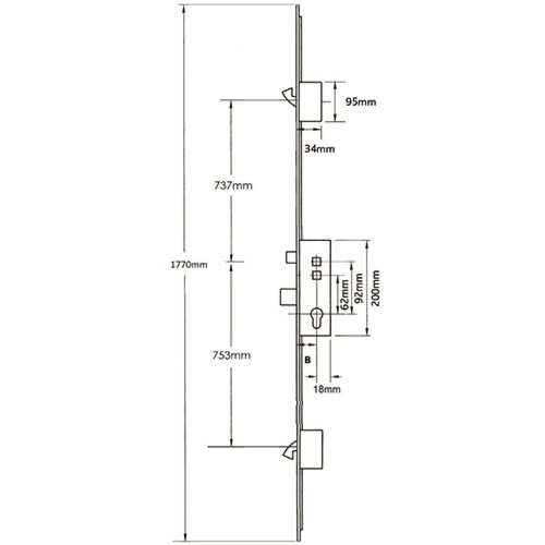 Centres are positioned at 62mm and 92mm with the top spindle being 122mm from the bottom of the case. Single spindle locks have a round hole where the second spindle would usually be located. The gearbox is pierced to accept a bolt through fixing 19mm from the top spindle, and the slot above for fixings is 42mm above the spindle.