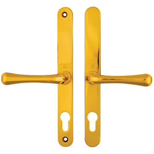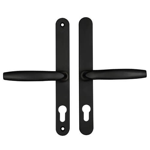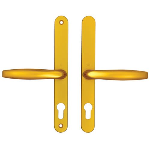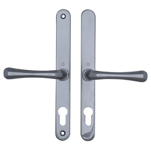 This Hoppe UPVC lever lever multipoint door lock handle from the Brugge* range suit Fullex SL16 multipoint locks with 68pz centres. They have sprung internal and external levers on a backplate of 244mm x 30mm which is available in various finishes.