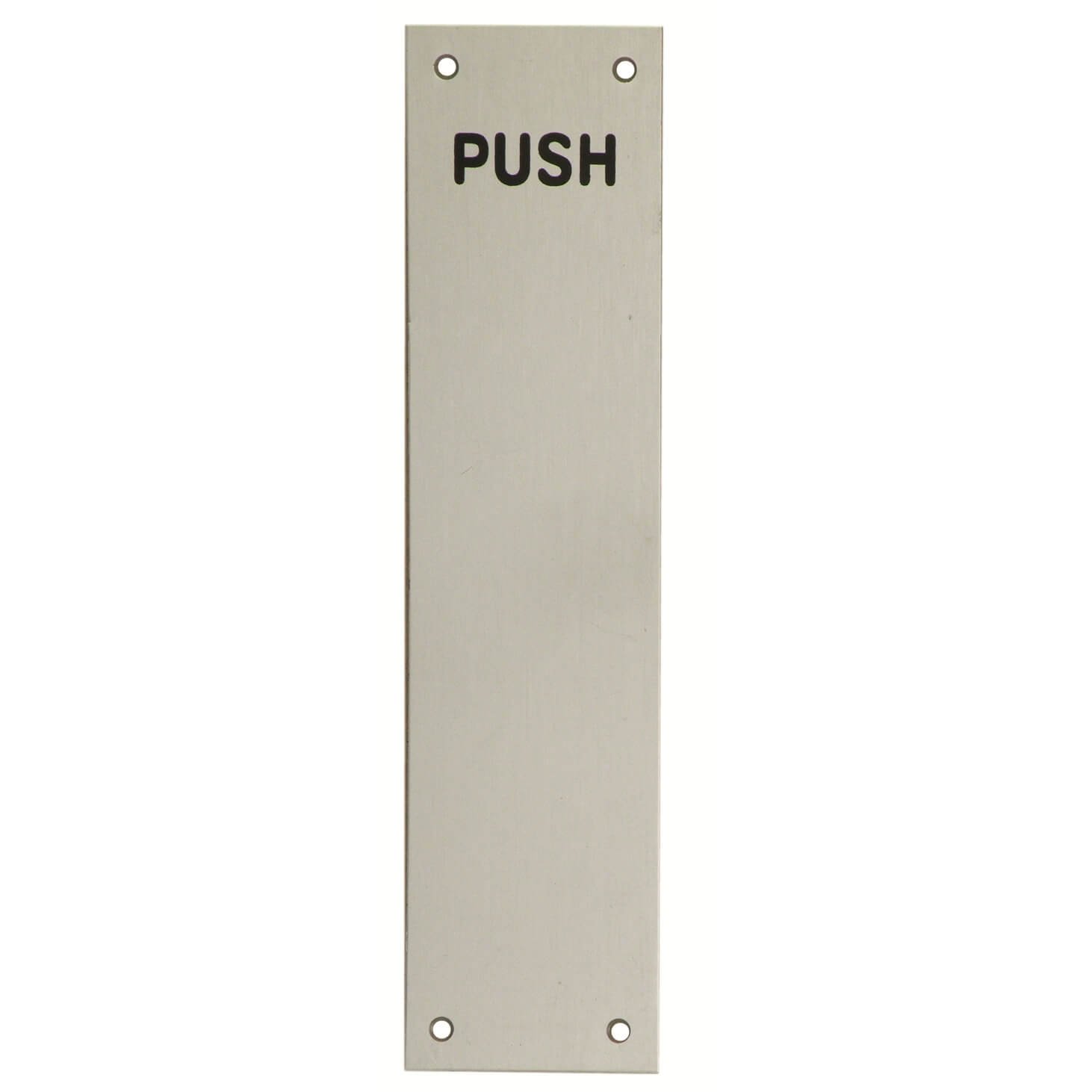 This satin anodised aluminium finger plate is printed with the word ‘PUSH’ in black lettering to help it stand out. Face-fix with four countersunk fixing points to allow screws to sit flush with plate. Often used in public areas and commercial spaces, these aluminium push plates will not rust or corrode and are suitable for use on both entrance doors and internal doors alike. Often used in conjunction with a pull handle on a plate mounted to the other side of the door.