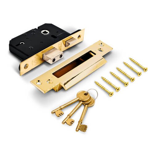 This TSS British Standard BS3621:2007 5 lever mortice sashlock has black powder coating with rounded forend with square faceplate.