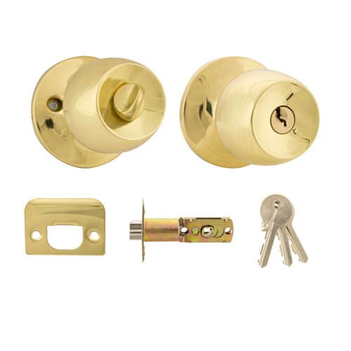 Featuring a keyway on one side and a knob turn on the other, this entrance set is available in brass or stainless steel finishsuiting 44mm thick doors.